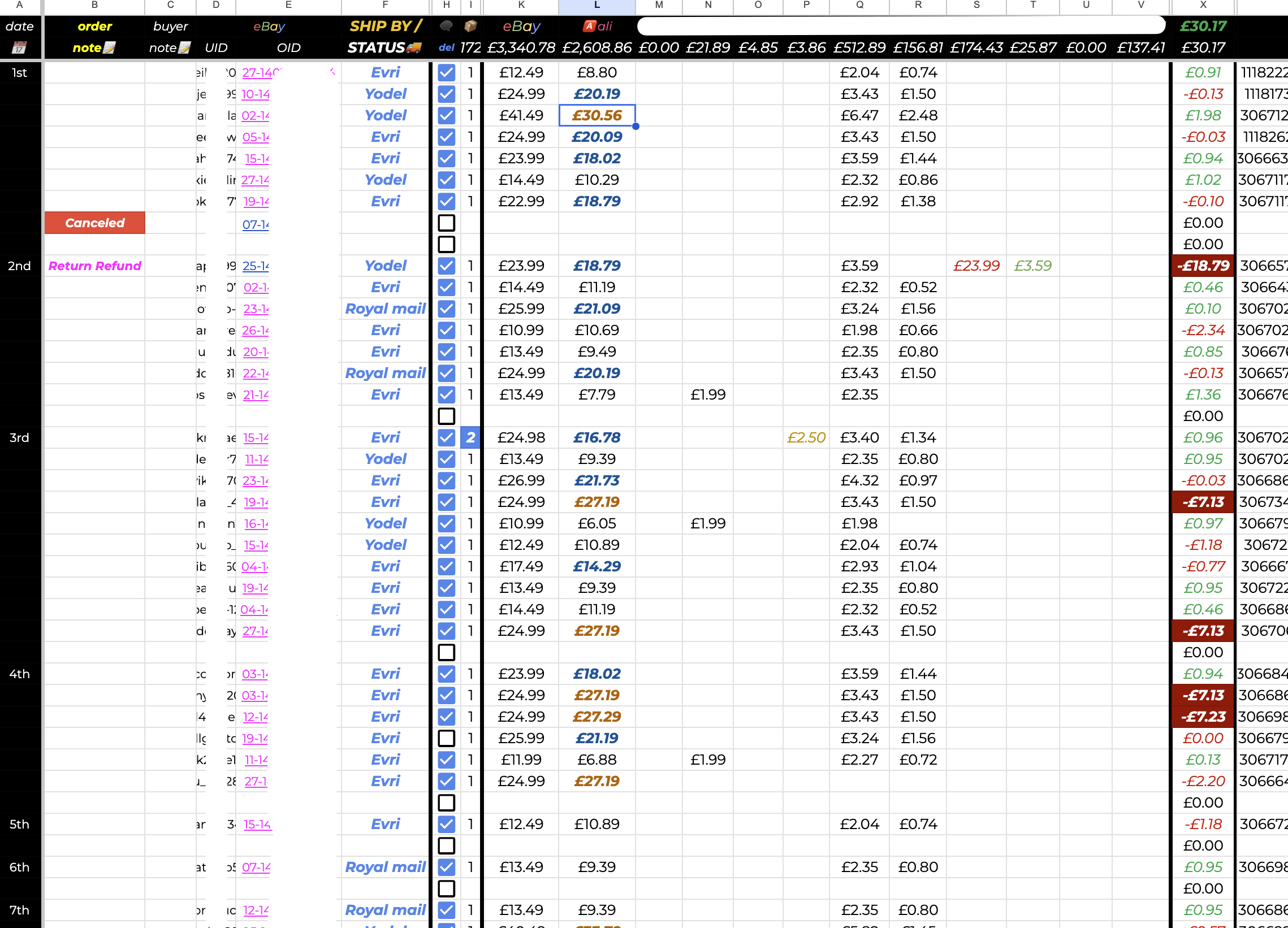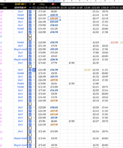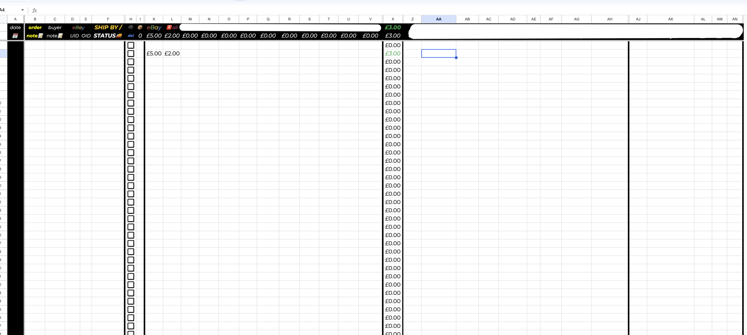 🛒 Order tracker with columns for buyer info, item, price, fees, shipping, and profit